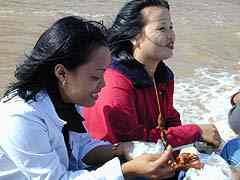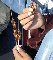 Tout le monde mange à bord, et ces jeunes filles, se délectent d'une spécialité saisonnière, des brochettes de criquets au miel