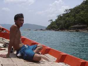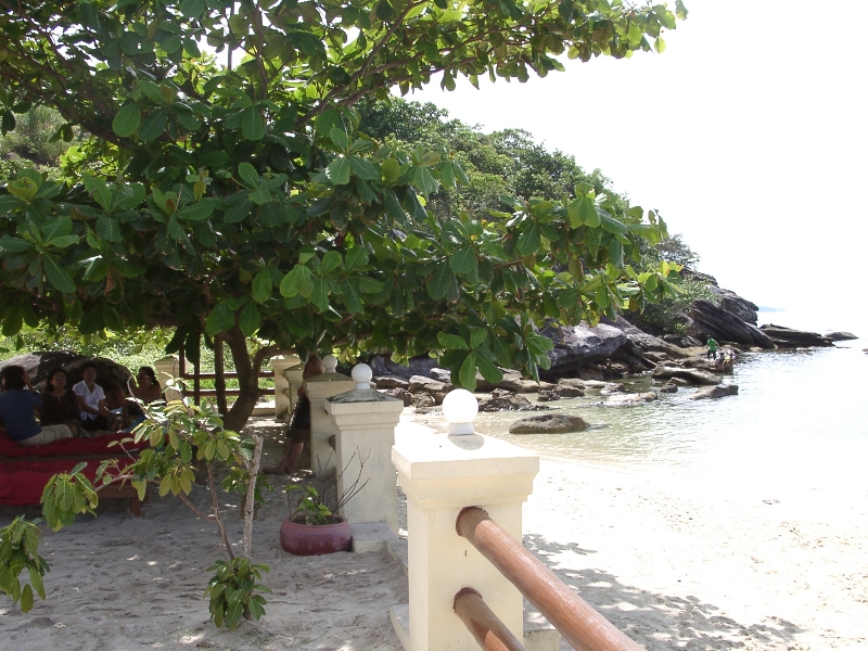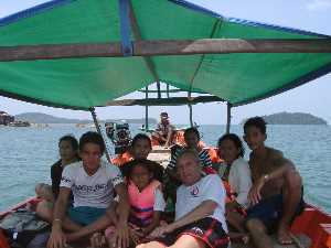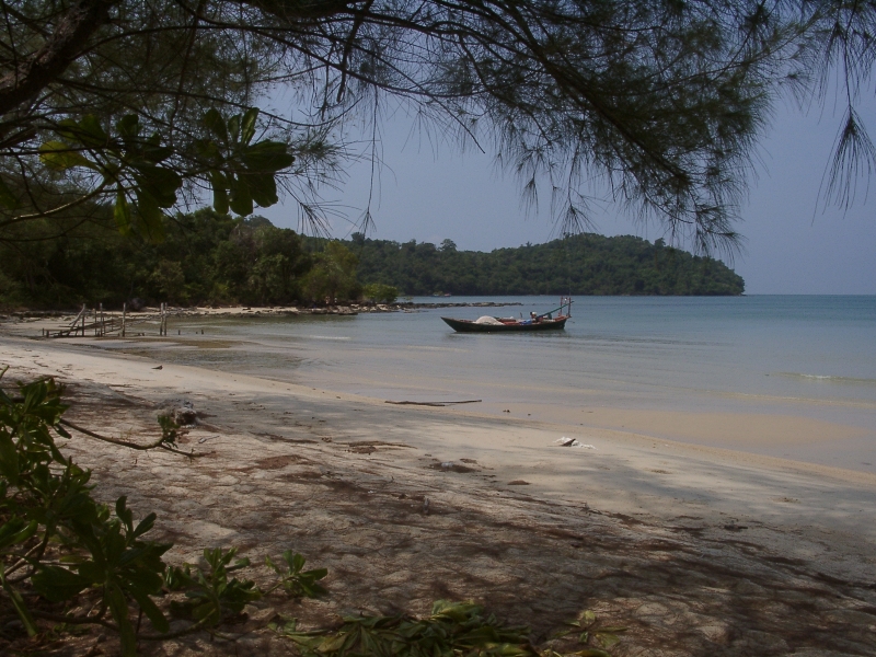Les images sont agrandissables, ici notre 'ile secrète' à Ream et notre bateau ou se trouve palmes, masques, tubas et matériel de pêche.