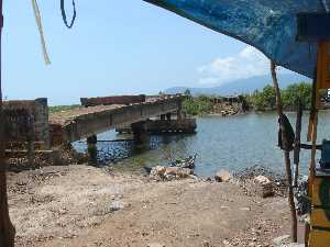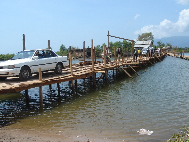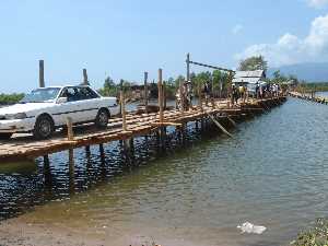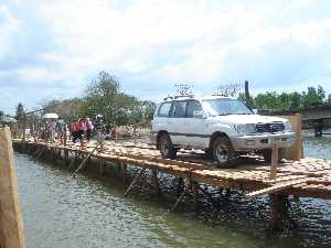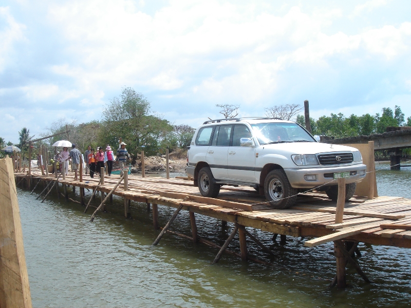 Entre Kampot et Phnom Penh à gauche l'ancien pont à droite le pont actuel. Gros bus et camions ne sont pas admis. Tous le monde à pied pour traverser l'ouvrage. "Hors des sentiers battus"