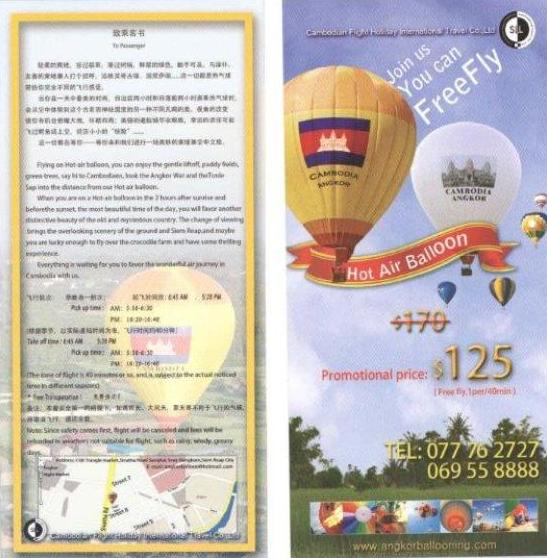 Autre façon de découvrir Angkor Wat. La montgolfière qui décolle d’un lieu situé à un kilomètre à l’ouest de l’entrée d’Angkor Wat et vous survolerez les sites pendant une dizaine de minutes.